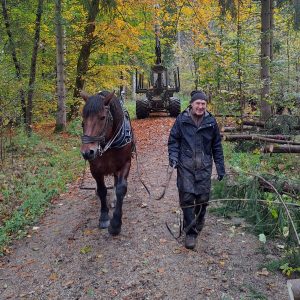 Поки коні витягують деревину з лісового масиву, сучасний трелювальний тягач (форвардер) займався штабелюванням уздовж дороги.