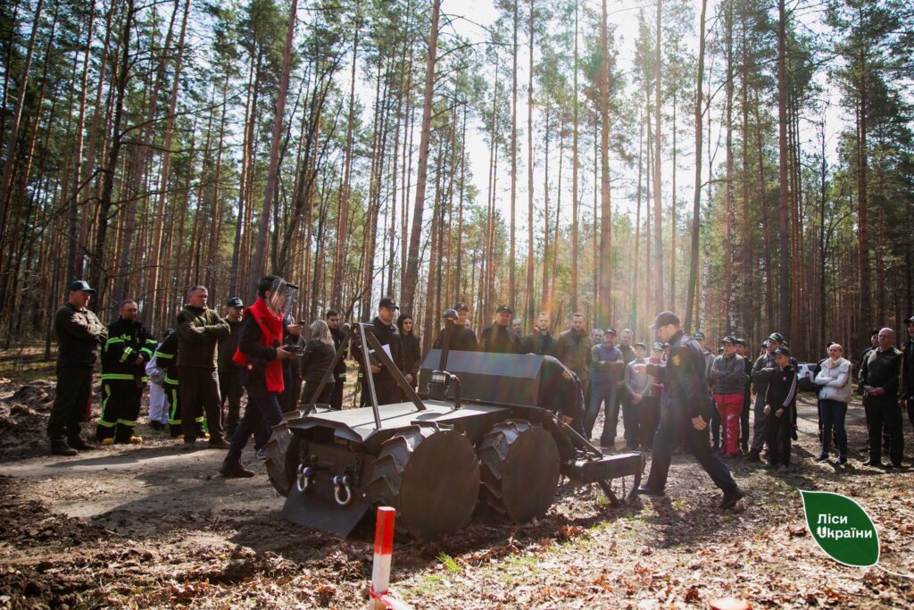 Керівник ДСНС Київщини Сергій Дишкант продемонстрував наземний колісний дрон українського виробництва на дистанційному управлінні, який витримує вибухи протитанкових мін. Техніка компактна, мобільна та здатна пришвидшити процес розмінування лісів. Але навіть вона, на жаль, не здатна повністю виключити процес «ручного» обстеження лісових масивів.