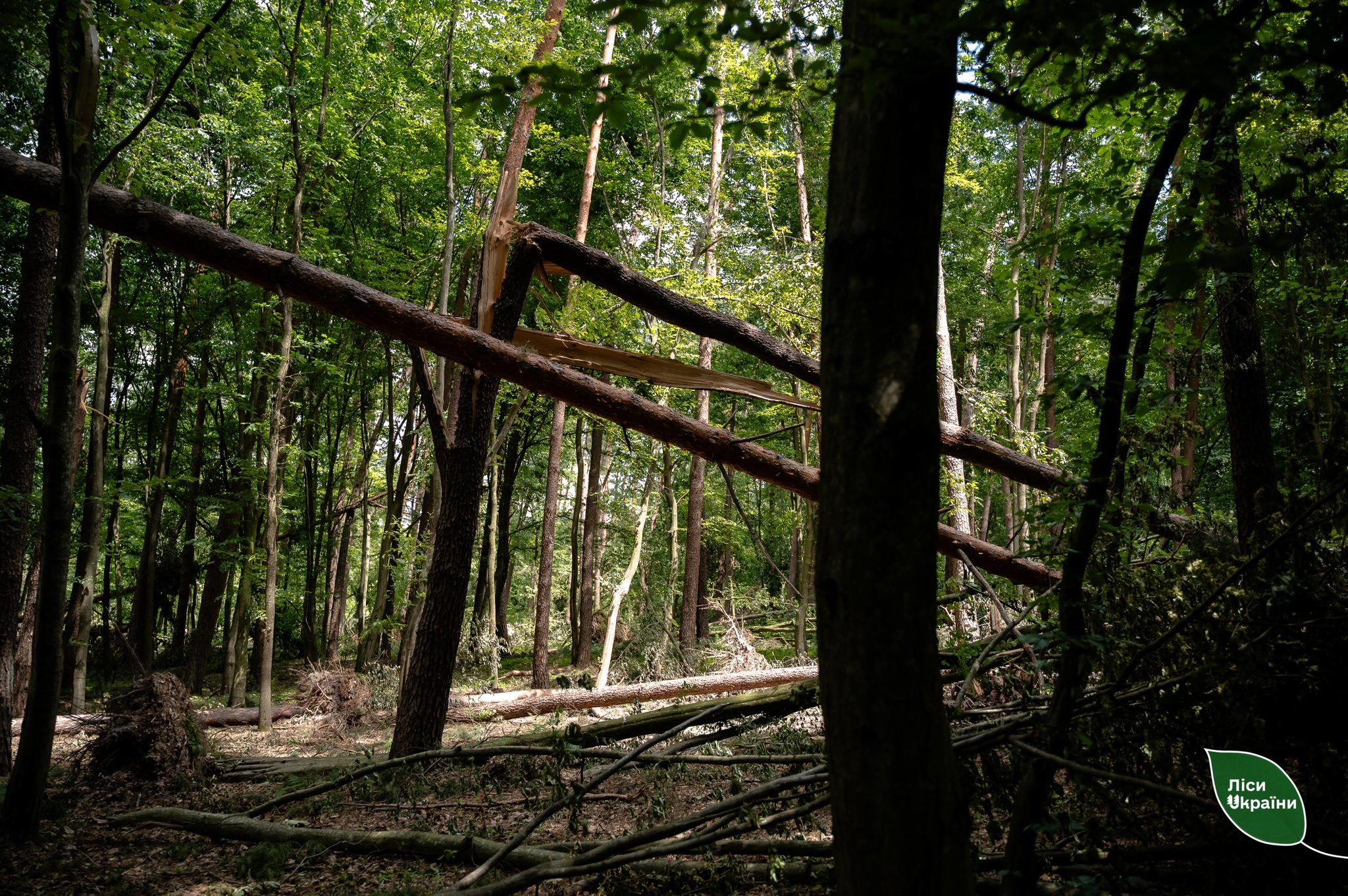 Eighty-one forest plots across seven forestry units of Kostopilske Forestry Management Unit were affected. In eighteen plots, 90–100% of the stands were damaged—more than 200 hectares requiring clear-cutting. Another 63 plots exhibit damage levels of 25–80 %. Throughout many areas, trees were snapped in half or uprooted. The most severely affected species were pine, oak, alder, and birch.